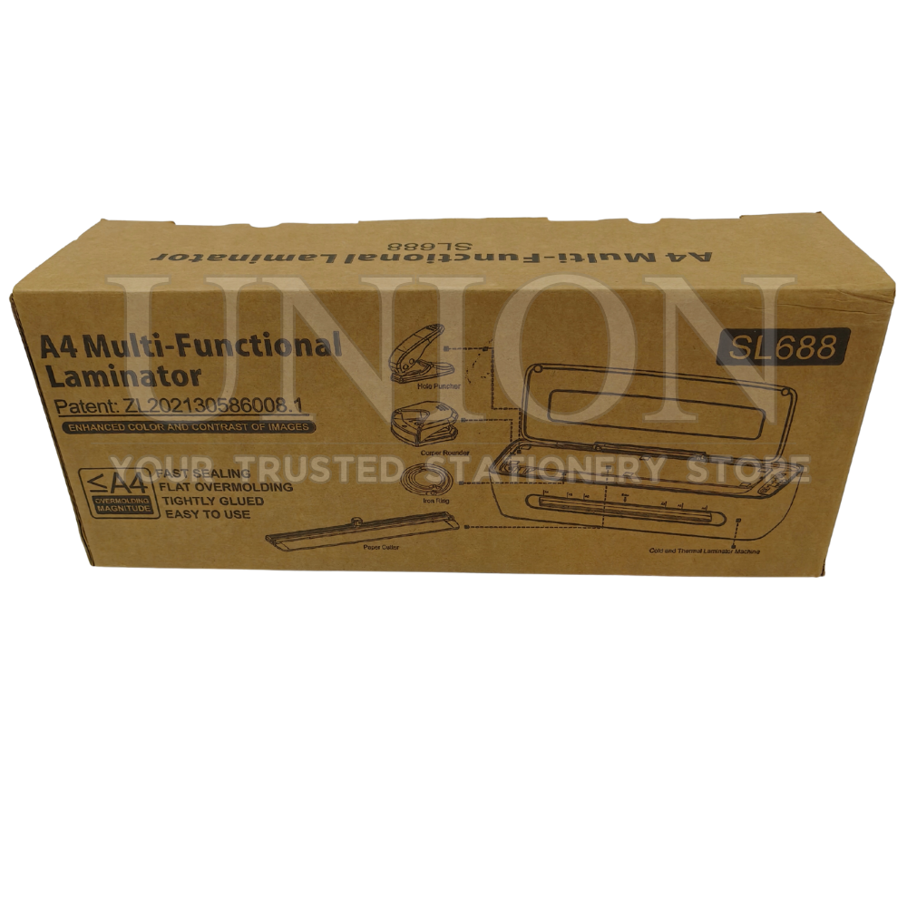 6-in-1 multifunction laminator: hot & cold laminating, paper cutter, corner rounder, hole puncher, and hoop binding.